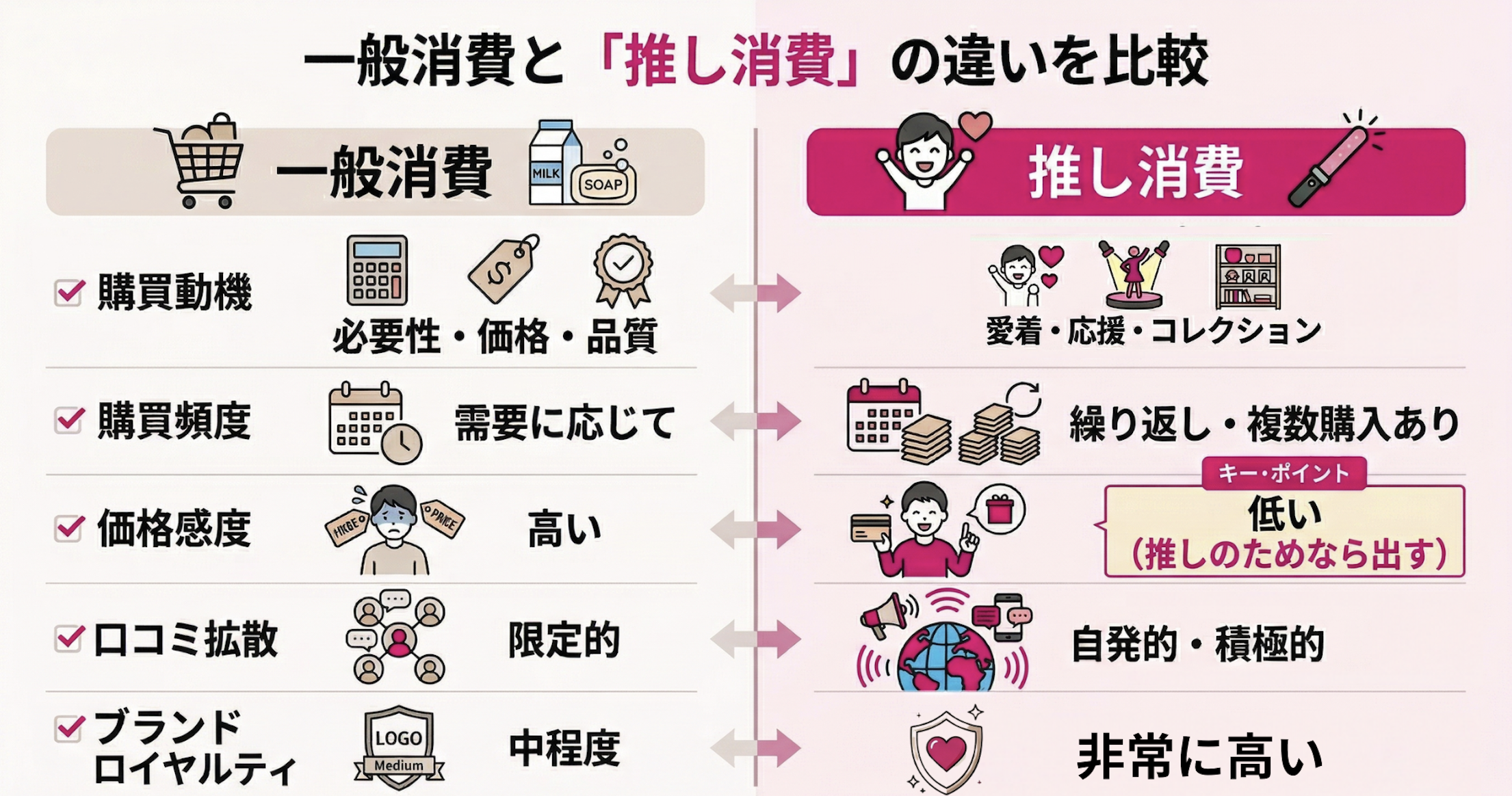 このように推し消費は一般的な消費行動とは根本的に異なる構造を持っており、企業がこの心理を理解することがマーケティング活用の第一歩です。
